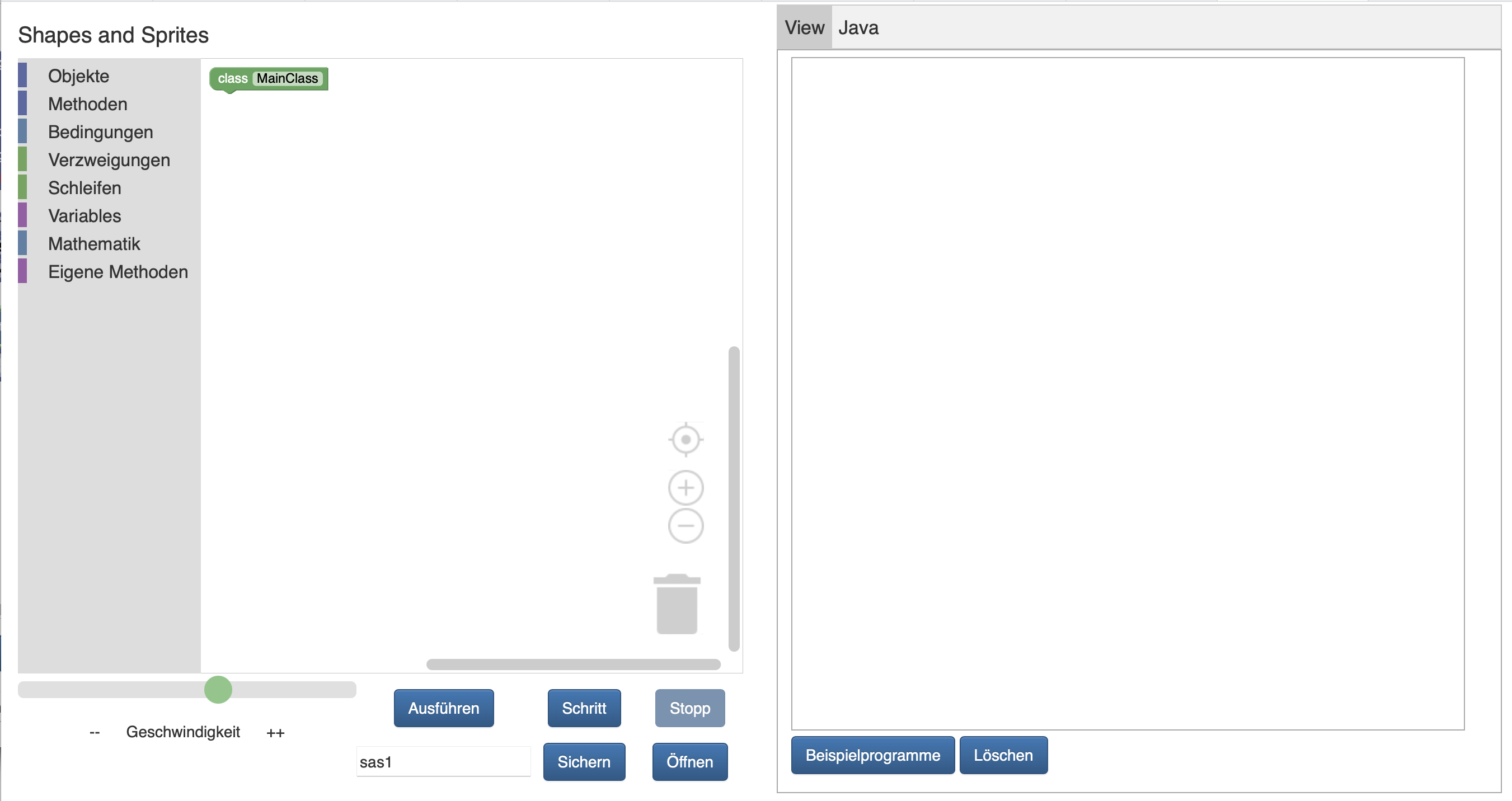 Mit SASBlockly können Sie in einer browserbasierten visuellen Programmiersprache Programme schreiben, die geometrische Objekte wie Rechtecke und Kreise zeichnen und bewegen bis hin zu tastatur- oder mausgesteuerten Spiele. Die Programme erstellen Sie, indem Sie Blöcke aus der Toolbox, die sich bei Klick in die Menüleiste öffnet, unter den bereits vorhandenen main-Block in das Programmfenster ziehen oder durch Klick auf einen Button automatisch erzeugen lassen. Gestartet wird ein Programm durch Klicken der Taste Ausführen. Die vom Programm erzeugten Grafiken werden auf der mit View bezeichneten Leinwand gezeichnet. Das Grafikfenster hat eine Breite und eine Höhe von 600 Pixeln. Der Koordinatenursprung ist wie im Kapitel "geometrische Objekte" beschrieben in der linken oberen Ecke.